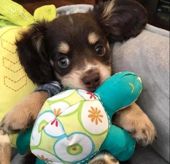 只見(jiàn)狗狗乖乖的躺在它的小床上,枕著枕頭,抱著玩具,頭上還夾著小發(fā)卡,像個(gè)小寶寶。